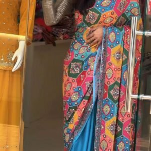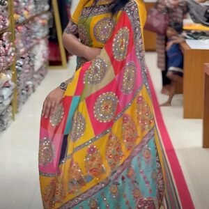 soft shine shinon ho fabric multi color print with hand work mirror pasting work cut with running blouse